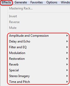 Рассмотрим 3 основных эффекта, которые в большей степени относятся к редактированию звука. Для их выбора, щелкните в верхней части программы Adobe audition по слову Effect: