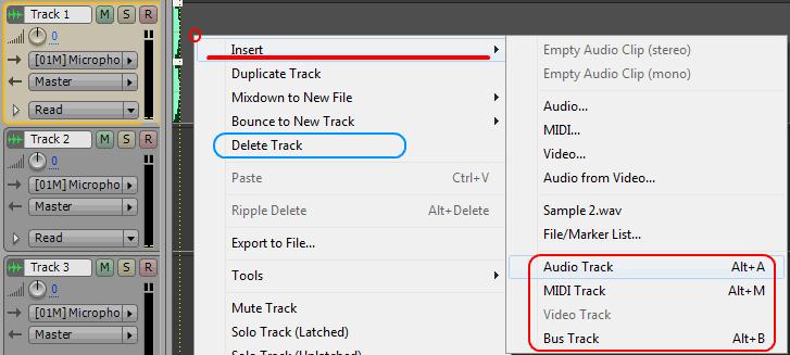 Для того чтобы добавить трек, нажмите по пустому месту (не по сэмплу) на треке правой кнопкой мыши. Выберите Insert и какой вид трека вы ходите добавить. Для удаления трека выберите Delete (синяя область).