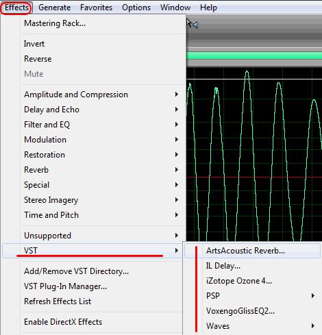 После этого опять нажмите Effects и выберите Refresh Effects List (обновить список эффектов). После нажатия подождите некоторое время пока Adobe Audition просканирует папки которые вы ему указали.