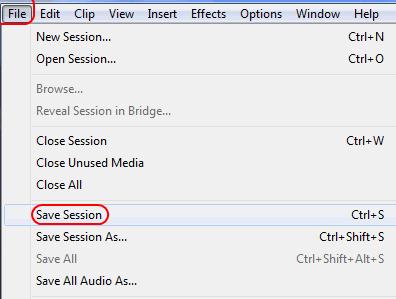 После того как вы сделаете все необходимое в многодорожечном режиме, сохраните сессию (сохранятся расположение всех сэмплов, эффектов и сами сэмплы). Для этого выберите File => Save session (Save session As (сохранить сессию как)):