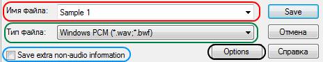 В опциях формата Windows PCM по умолчанию выбран лучший вариант, так что просто введите нужное имя файла и сохраните его. Но обратите внимание на синюю область на картинке выше (Save extra non-audio information). Если там не стоит галочка, то при сохранении аудио файла программа вместе с ним сохранит еще 1 файл (информационный файл для звука):