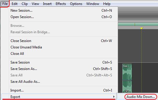 Для того, чтобы сохранить все, что вы составили в сессии в один аудиофайл, нажмите File => Export => Audio mix Down: