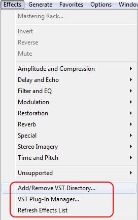 Для того чтобы подключить плагин необходимо сначала указать папку где они находятся. Для этого щелкните по вкладке Effects и выберите Add/Remove VST Directory: