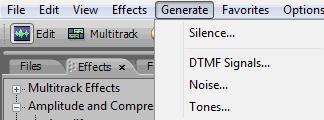 Вставка тишины в файл. Установите желтый маркер в то место в которое вы хотите добавить тишины, выберите данный генератор и введите необходимую длительность тишины в поле Silence Time измеряемое в секундах.