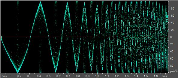Дисплей Spectral Pan отображает панорамную позицию (в правом и левом канале) каждой частоты в звуковом файле. На оси Х (горизонтальная линейка) отложено время, на оси Y (вертикальная линейка) – измерение панорамной позиции. Верхняя часть дисплея (-100 %) соответствует нахождению частоты только в левом канале, нижняя часть дисплея (100 %) соответствует нахождению частоты только в правом канале. Чем ярче цвет, тем громче данная частота.