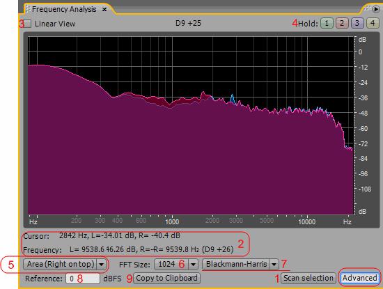 Frequency Analysis предназначен для выявления проблематичных полос частот для последующего исправления ситуации с помощью эквалайзера. В этой панели горизонтальная ось представляет собой частоту (измеряется в Гц), а вертикальная ось представляет собой амплитуду соответствующей частоты (измеряется в децибелах).