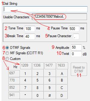 1. Dial String (строка циферблата) – определяет номер телефона, для которого Вы хотите сгенерировать сигнал. Вы также можете ввести другие символы, такие как звездочка (*) и решетка (#), а также буквы "А", "B", "C" и "D"; "," – пауза.