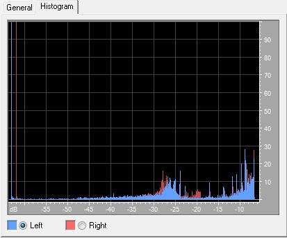 Вкладка "гистограмма" график, который показывает относительную распространенность каждой амплитуды: горизонтальная линейка это амплитуда в децибелах, а вертикальная линейка это RMS сигнала. Выберите Left или Right для отображения на переднем плане левого или правого канала.