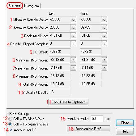 В окне статистики амплитуды, вы можете получить доступ к конкретным точкам сигнала, во вкладке General, изменить настройки RMS с помощью плагинов и пересчитать статистику заново.