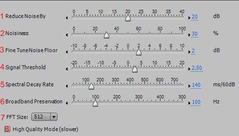 3. Fine Tune Noise Floor (точная настройка нижнего уровня шума) – регулирует нижний предел силы подавления шума, нижний предел рассчитываться автоматически, и с помощью данного параметра вы можете его изменить.