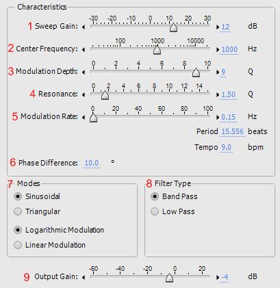 1. Sweep Gain (усиление движения) – позволяет изменять уровень громкости фазированного сигнала. Будьте осторожны, при применении высоких положительных значений, сигнал может клиппировать.