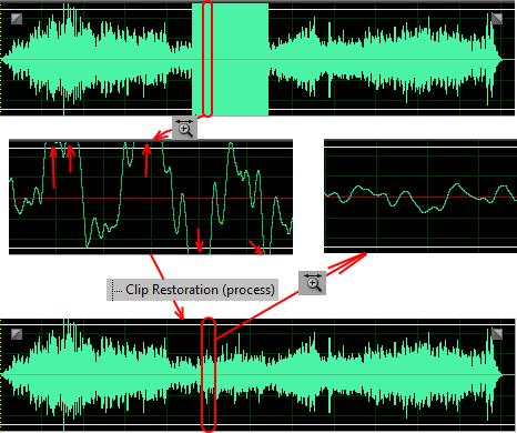 Эффект Clip Restoration восстанавливает клиппированные сигналы, заполняя их новыми звуковыми данными. Клиппинг возникает, когда амплитуда сигнала превышает максимально возможный уровень для текущего битового разрешения (например, уровень выше 256 в 8 битном звуке). Как правило клиппирование это результат записи при слишком большом уровне (громкости), когда уровень выходит выше 0 дБ. Такие моменты при сильном превышении слышны как треск, но если превышение не очень большое, то его может быть и не слышно. Для того чтобы увидеть клиппирование посмотрите на децибелометр, если на нем после значения 0 дБ появляются красные прямоугольники (синяя область на картинке ниже), это говорит о том что звук клиппирует.