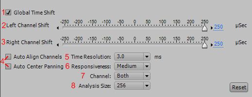 1. Global Time Shift (глобальный временной сдвиг) – активизирует перемещение ползунков смещения левого и правого каналов (2, 3), которые позволяют применять единый сдвиг фазы на весь выделенный аудио файл.
