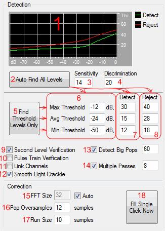 Если вы удаляете 1 щелчок за 1 раз, нажав кнопку Fill Single Click Now (18), выберите высокий размер FFT, хорошо работают значения от 128 до 256.