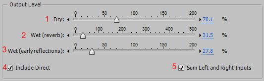7. Left/Right Location (локализация влево/вправо) – позволяет вам перемещать источник звука по комнате, что создает различный набор ранних отражений. Включение опции Include Direct в разделе Output Level, регулирует звук оригинального сигнала, как будто бы из того же места. Очень интересные эффекты можно получить при обработке вокала, если поместить источник немного в бок от центра, между 5 % и 10 % влево или вправо.