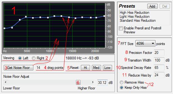 11. Reduce Hiss By (сокращение шипения) – устанавливает уровень сокращения шипения для звуков ниже уровня шума.