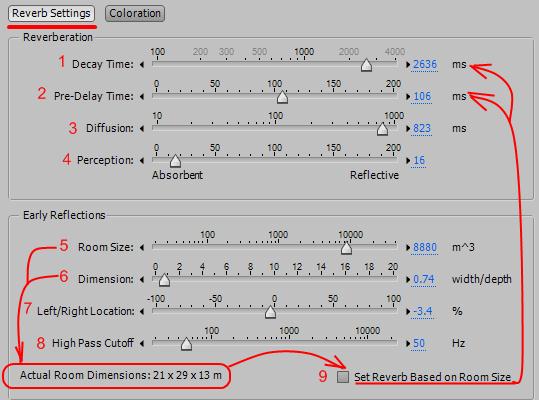 Когда вы меняете настройки реверберации, то эффект создает новый импульсный файл, который имитирует акустическую среду, которую вы создаете. Этот файл может быть размером в несколько мегабайт, и это может потребовать несколько секунд для его создания, поэтому вам придется подождать, прежде чем вы сможете предпрослушать эффект. Однако результаты, очень реалистичны и легко настраиваются.