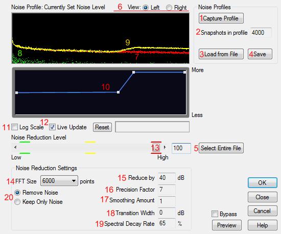 6. View (отобразить) – отображает профиль шума либо левого, либо правого каналов. Подавление шума всегда одинаково для обоих каналов. Для подавления различного количества шума в каждом из каналов, редактируйте каналы по отдельности.