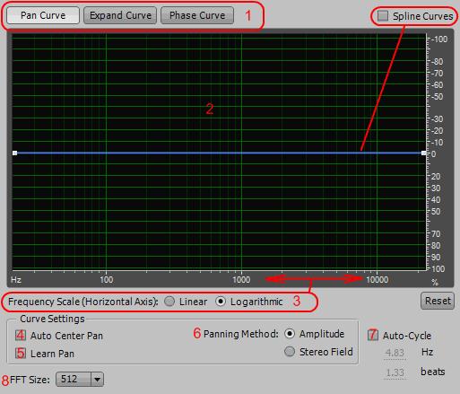 5. Learn Pan, Expand, or Phase (узнать панораму, ширину или фазу) – анализирует выбранный или проигрываемый звук, автоматически создавая кривую графика, которая отображает текущие позиции панорамы, ширины или фазы для каждой частоты.