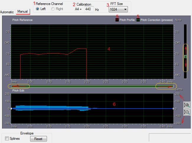 4. Pitch Reference graph (график изменения высоты тона) – отображает высоту тона в полутонах вдоль вертикальной линейки (ось Y) и время вдоль горизонтальной линейки (ось X), так что вы можете точно увидеть изменения высоты тона во всех частях звука.