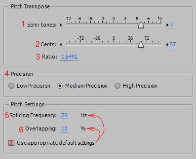 1. Semi‑tones (полутон) – транспонирование высоты тона в полутонах. Значение 0 оставляет высоту тона без изменения; +12 повышает высоту на октаву, а -12 понижает.