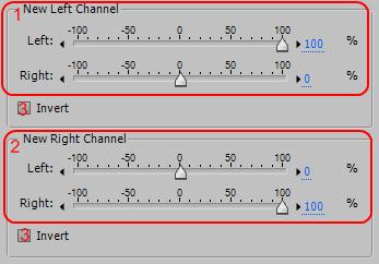 1. New Left Channel (новый левый канал) – определяет процент левого и правого каналов, при создании нового левого канала. Например, значения L50 и R50 создадут новый левый канал, который будет содержать в себе равное соотношение текущих L и R каналов. Тогда как значения L0 и R100, также создадут новый левый канал, содержащий в себе только звуки от текущего правого канала.