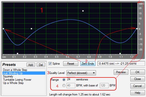 4. Range (диапазон) – устанавливает шкалу вертикальной линейки (Y-ось), в полутонах (semitones) или в ударах в минуту (BPM). Для шкалы в полутонах, питч изменяется логарифмически и вы можете указать количество полутонов для сдвига вверх или вниз. Для диапазона BPM, питч изменяется линейно и вы должны указать основной темп. Вы можете указать точный темп или любой другой.