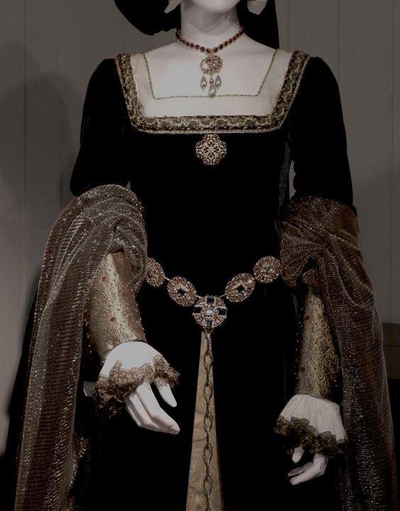 Платье из атласной ткани глубокого чёрного цвета, получаемого за счёт одного из самых дорогих пигментов, с минимальной декоративной вышивкой из золота и жемчуга на рукавах, шее и подоле в виде переплетающихся щупальцев кракена. К данному платью был изготовлен и отдельный набор украшений, подчеркивающий его красоту. Золотой сегментарный поясок на талию из квадратных пластинок, усыпанных рубинами. В таком же стиле выдержанное колье в виде герба дома Грейджоев. Единственная заминка вышла с сеткой для волос, у Аши она не столь... пышная. Нашли иной вариант, золотую узкую диадему-венок от другого ювелирного комплекта.