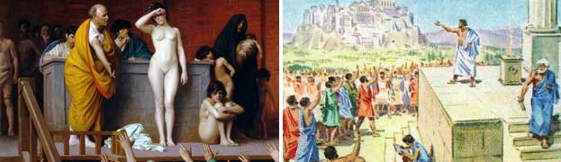 Нет, говорят, конечно, и о несчастной судьбе ни в чём не повинных коронейцев, халкидцев и карнунтцев. На словах очень даже им сочувствуют, но это ничуть не мешает добропорядочным афинянам смотреть, прицениваться, расспрашивать торговца о навыках и умениях живого товара, заглядывать ему в зубы, щупать мускулы и торговаться чуть ли не за каждую драхму. Налетай, подешевело! Раз уж налогов этих чрезвычайных избежать не удастся, так хотя бы часть убытка на дешёвых рабах можно компенсировать. К ним-то, приобретающим всех этих рабов честно за свои честно заработанные деньги, какие у кого могут быть претензии? Это же только бизнес, ничего личного.