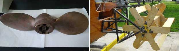 Но это в теории хорошо, а как оно на практике себя покажет с деревянным-то винтом? Не сталь ведь, не бронза, даже не дюраль. Хрен его знает, как он на испытаниях себя покажет. Может сразу большой износ пойти, может и ступица треснуть, не выдержав нагрузки. Млять, как бы не пришлось тогда резервный вариант применять, колёсный, как на ранних пароходах. Громоздкий движитель тогда получится и малообтекаемый, намного ниже будет КПД, но с другой стороны, есть и преимущества. Не надо возиться ни с каким подвесным вариантом мотора или дейдвудом. Мотор стационарно будет крепиться, а ось колёс заведомо над ватерлинией будет проходить. И сами колёса вполне себе сгодятся и в деревянном исполнении. Один хрен такого же примерно типа они будут делаться и для их наплавных мини-ГЭС. Работали же в старину мельничные? Ну так и эти водяные – а куда они на хрен денутся? Громоздкий вариант, архаичный, и не хочется его, но если винтовой в дубовом исполнении не прокатит, то какой у них тогда останется выбор? Жить захочешь – не так ещё раскорячишься.