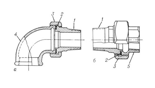 Штуцерное соединение: а – с угольником; б – с муфтой; 1 – штуцер; 2 – уплотнительная прокладка; 3 – накидная гайка; 4 – угольник; 5 – муфта.