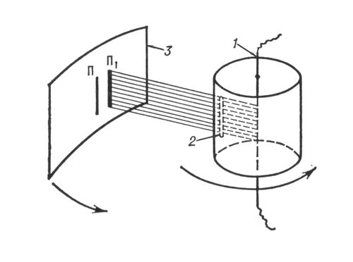 Схема опыта Штерна: 1 – платиновая проволока с нанесённым на неё слоем серебра; 2 – щель, формирующая пучок атомов серебра; 3 – пластинка, на которой осаждаются атомы серебра; П и П1 – положения полосок осажденного серебра при неподвижном приборе и при вращении прибора.
