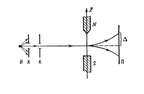 Схема опыта Штерна-Герлаха: И – источник атомов; К – щели, формирующие узкий пучок; N, S – полюса магнита, создающего постоянное неоднородное поле; П – пластинка, на которую оседают атомы; ∆ – величина отклонения пучка от первоначального направления. Опыт производится в вакууме.