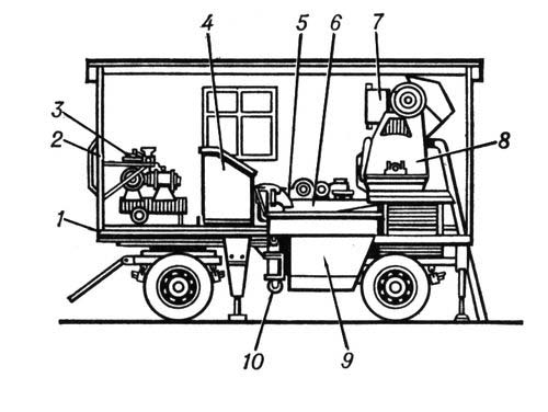Передвижная штукатурная станция: 1 – площадка автоприцепа; 2 – патрубок; 3 – компрессор; 4 – пульт управления; 5, 10 – растворонасосы; 6 – вибросито; 7 – дозировочный бак; 8 – растворосмеситель; 9 – промежуточный бункер.