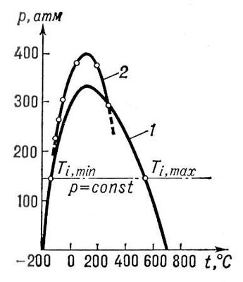 Инверсио'нная крива'я, кривая на диаграмме состояния , ограничивающая область состояний вещества, для которых переход вещества от более высокого давления к низкому (в процессе дросселирования ) связан с понижением температуры (см. Джоуля – Томсона эффект ). За пределами этой области вещество (газ, жидкость) при дросселировании нагревается. Линия постоянного давления (изобарар = const, см. рис. ) пересекает И. к. в двух инверсионных точках: верхней (Ti ,max ) и нижней (Ti ,min ). Верхняя точка лежит в области газообразного состояния вещества, нижняя – жидкого состояния. При Ti ,min < T < Ti ,max в определённом интервале давлений газ может быть сжижен путём дросселирования, при T > Ti ,max этого добиться нельзя. Чем ближе газ по своим свойствам к идеальному газу , тем ниже его температура инверсии (у водорода, например, при атмосферном давлении Ti ,max = – 57°C, у гелия Ti ,max = – 239°C). Для сжижения гелия методом дросселирования его температура должна быть предварительно понижена до – 239 °С (см. Сжижение газов ).