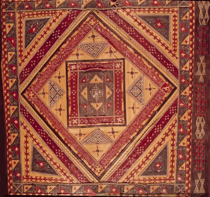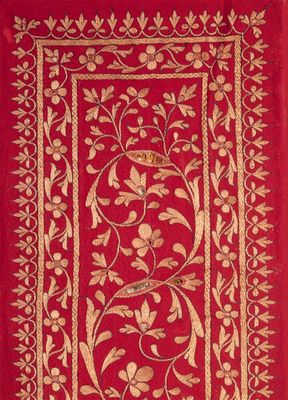 Украшение для кровати новобрачных. Минангкабау (Центральная Суматра). Парчовая ткань на хлопчатобумажной основе с шитьём золотой нитью. 1900-е гг. Музей антропологии и этнографии АН СССР, Ленинград.