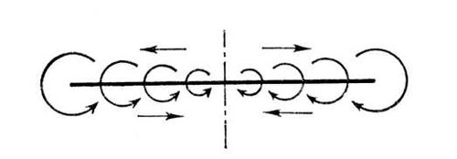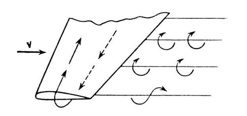 Рис. 2. Разрез потока за крылом плоскостью, перпендикулярной v. Течение воздуха у торцов вызывает систему свободных вихрей.