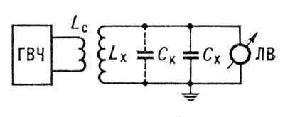 Рис. 3. Схема измерения индуктивности методом резонанса: ГВЧ – генератор ВЧ; Lc – витки связи; Lx – измеряемая индуктивность; Cк – собственная ёмкость катушки; Cx – образцовая ёмкость; ЛВ – ламповый вольтметр.