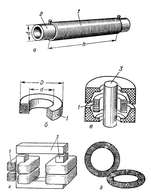 Катушки индуктивности: а – цилиндрическая однослойная; б – тороидальная многослойная; в – с цилиндрическим сердечником; г – с П-образным сердечником; д – образцовая индуктивность на керамическом тороиде; 1 – намотка (провод); 2 – каркас; 3 – сердечник; h – длина намотки; d – внутренний диаметр намотки; D – наружный диаметр намотки.