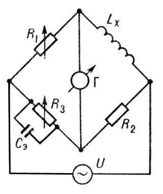 Рис. 2. Схема моста для измерения индуктивности: U – источник тока; Г – гальванометр; R1 , R2 , R3 – омические сопротивления; Сэ – образцовая ёмкость; Lx – измеряемая индуктивность.