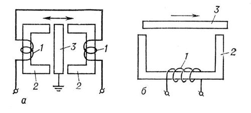 Схема конструкции индуктивного датчика: а – с переменным воздушным зазором; б – с переменной площадью воздушного зазора: 1 – катушка индуктивности; 2 – сердечник; 3 – якорь.