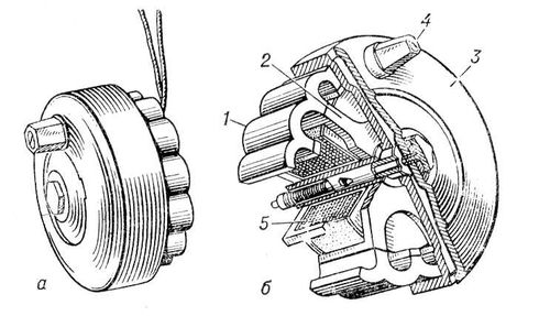 Рис. 2. Индуктор с неподвижной обмоткой: а – общий вид; б – разрез; 1 – многополюсный вращающийся постоянный магнит (ротор); 2 – статор из мягкой стали; 3 – вращающийся диск; 4 – рукоятка; 5 – обмотка статора.