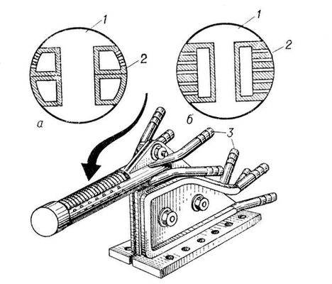 Рис. 2. Петлевой индуктор для закалки внутренних цилиндрических поверхностей способом одновременного нагрева при вращении закаливаемой детали: а – конструкция с отдельными камерами для охлаждения индуктора и выхода закалочной воды; б – конструкция без постоянного охлаждения; 1 – магнитопровод; 2 – индуктирующий провод; 3 – трубопровод водяного охлаждения.