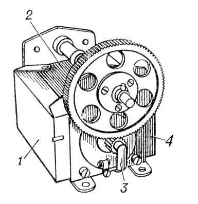 Инду'ктор телефо'нный, магнитоэлектрическая машина с ручным приводом, применяемая в телефонных аппаратах для посылки сигналов вызова и отбоя на станции ручного обслуживания в сельской телефонной связи . И. т. вырабатывает переменный ток с частотой 18—21 гц , напряжением 60—70 в и мощностью 3,8 вт (на сопротивлении нагрузки 2,5 ком ). Выпускаются 2 типа И. т.: с двумя неподвижными прямоугольными магнитами, вращающимся якорем (с обмоткой), редуктором и токосъёмными пружинами (рис. 1 ); с неподвижным якорем (с обмоткой) и вращающимся многополюсным магнитом кольцеобразной формы (рис. 2 ). Необходимая частота тока обеспечивается при вращении рукоятки с частотой 3—3,5 об/сек.