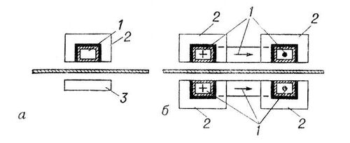 Рис. 4. Схема индукторов для нагрева листового материала в поперечном магнитном поле при размещении индуктирующего провода: а – с одной стороны нагреваемого листа; б – с обеих сторон нагреваемого листа; 1 – индуктирующий провод; 2 – магнитопровод; 3 – ярмо магнитопровода.