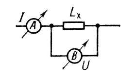 Рис. 1. Схема измерения индуктивности по методу «вольтметра – амперметра»: А – амперметр; В – вольтметр; Lx – индуктивность;I – сила тока; U – напряжение .