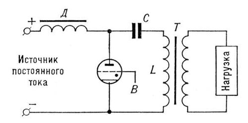 В автономных И. (рис. 2 ) конденсатор С заряжается через дроссель D от источника постоянного тока, а затем разряжается через вентиль В и первичную обмотку трансформатора Т . В его вторичной обмотке получается чисто переменный ток.