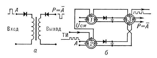 Рис. 4. Схема импульсного инвертора: a – на импульсном трансформаторе; б – на ферритовых сердечниках; А – входной сигнал; Р – выходной сигнал; ТИ – тактовые импульсы; Uсм – смещение.