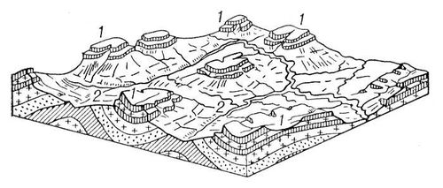 Инверсия рельефа: 1 – останцовые возвышенности, приуроченные к синклинальным структурам в результате выхода на поверхность пластов стойких горных пород; 2 – речные долины, заложенные вдоль сводов антиклиналей, сложенных податливыми горными породами.