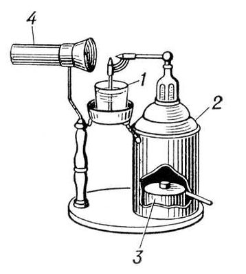 Переносной ингалятор для паровой ингаляции: 1 – стаканчик; 2 – резервуар; 3 – спиртовка; 4 – стеклянная воронка (для вдыхания пара).